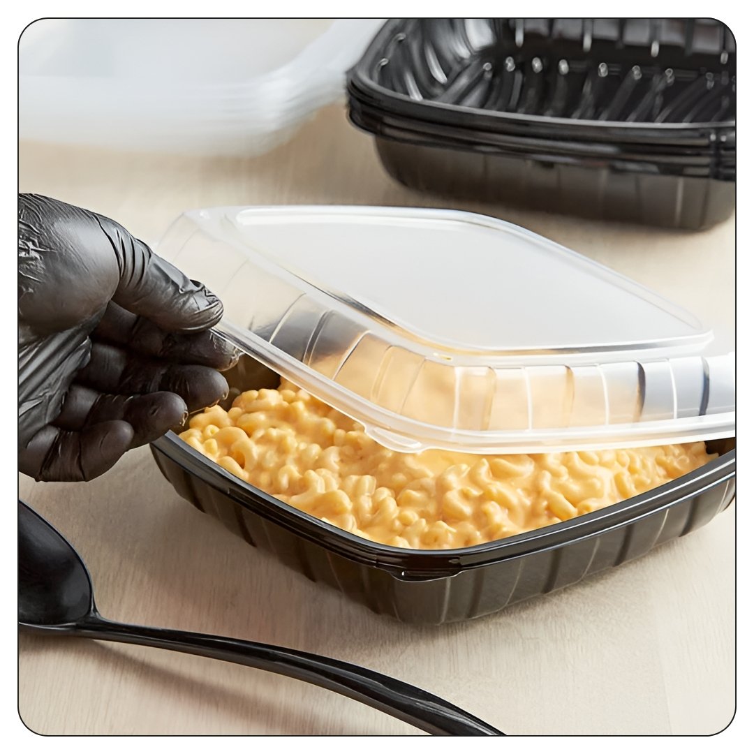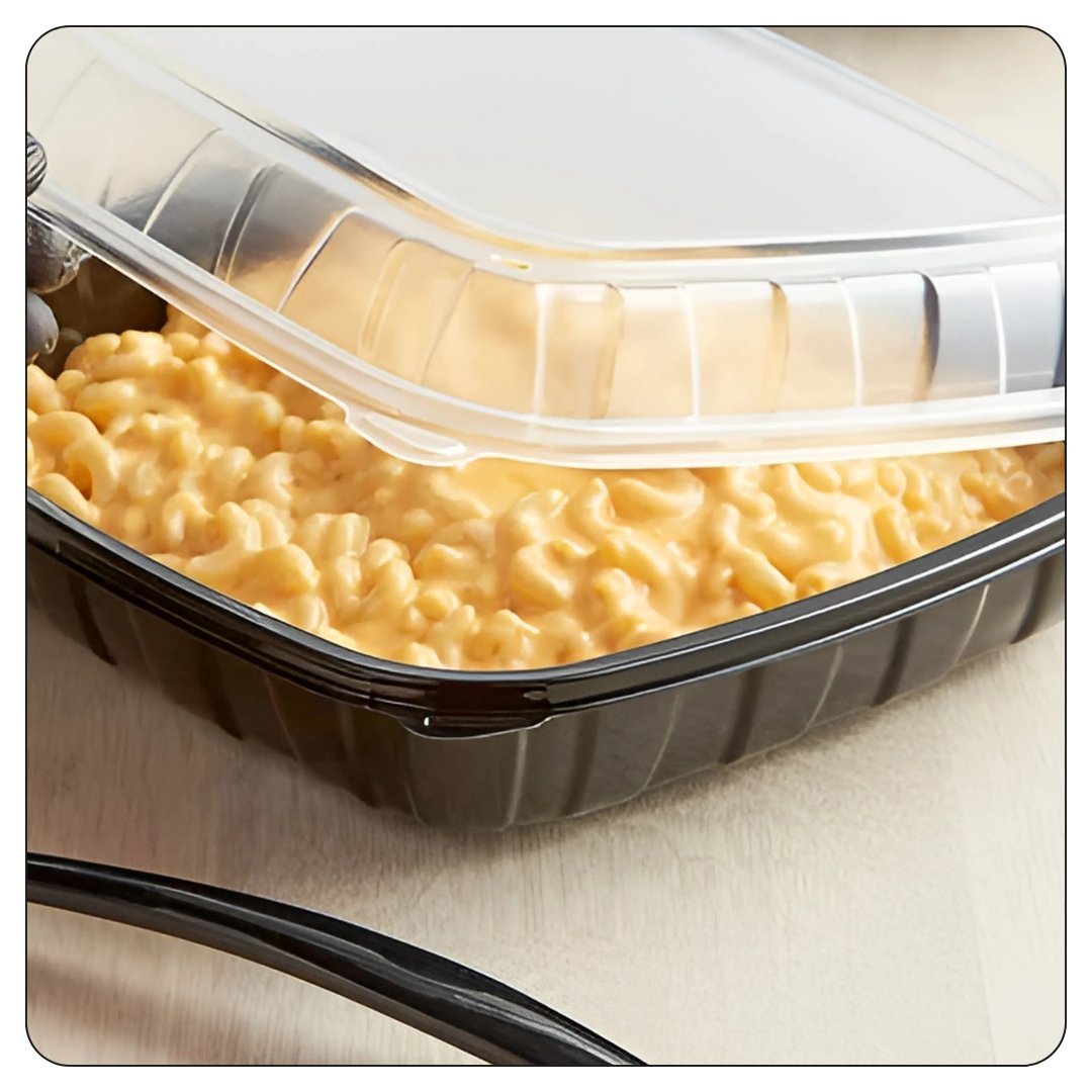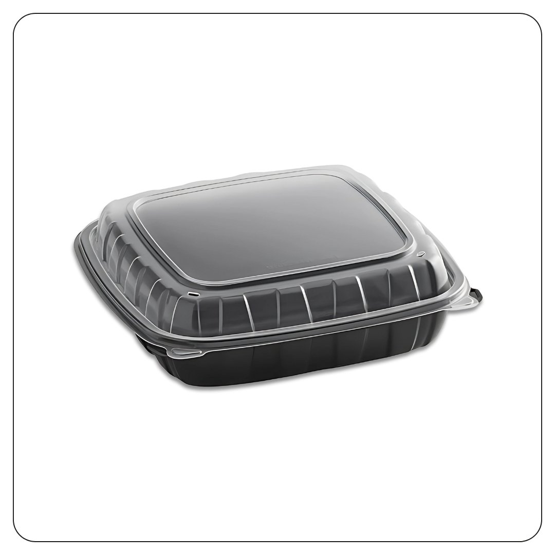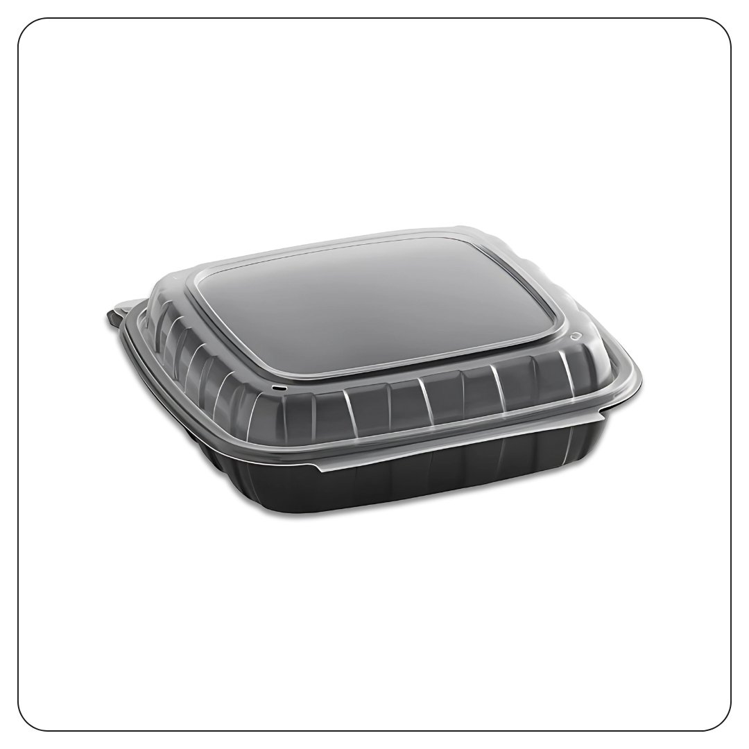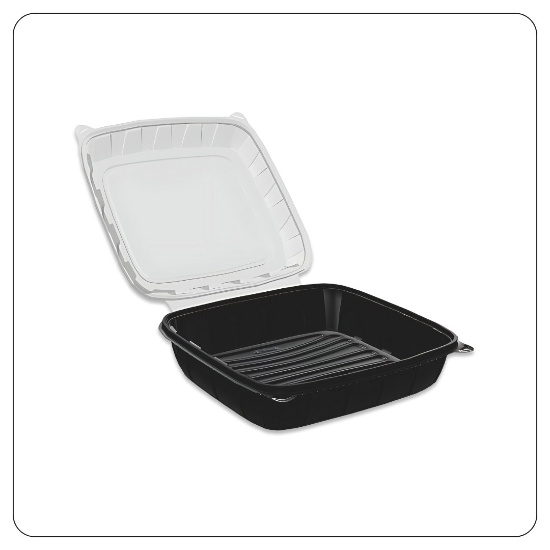 Microwavable 1-Compartment Black / Clear Plastic Hinged Container 9″x9″x3″
