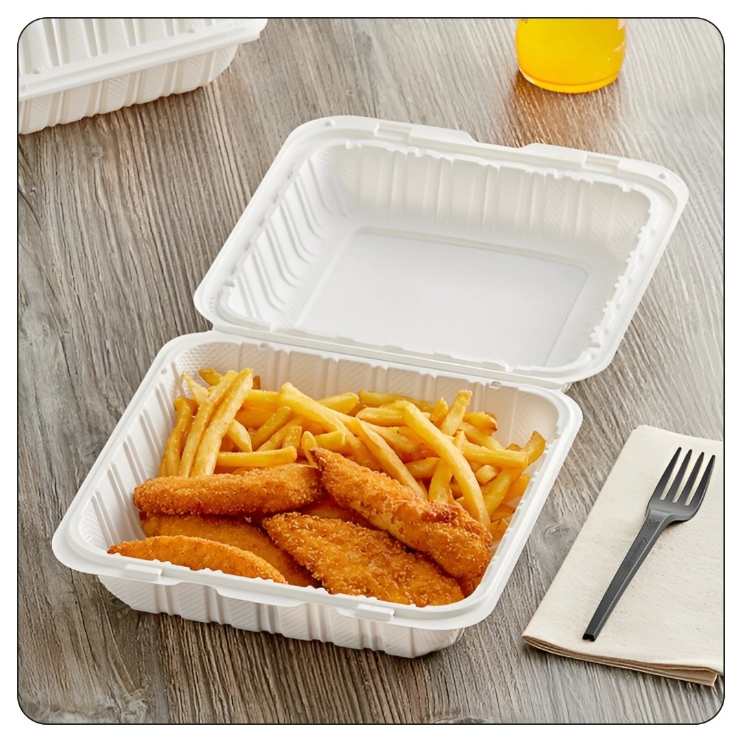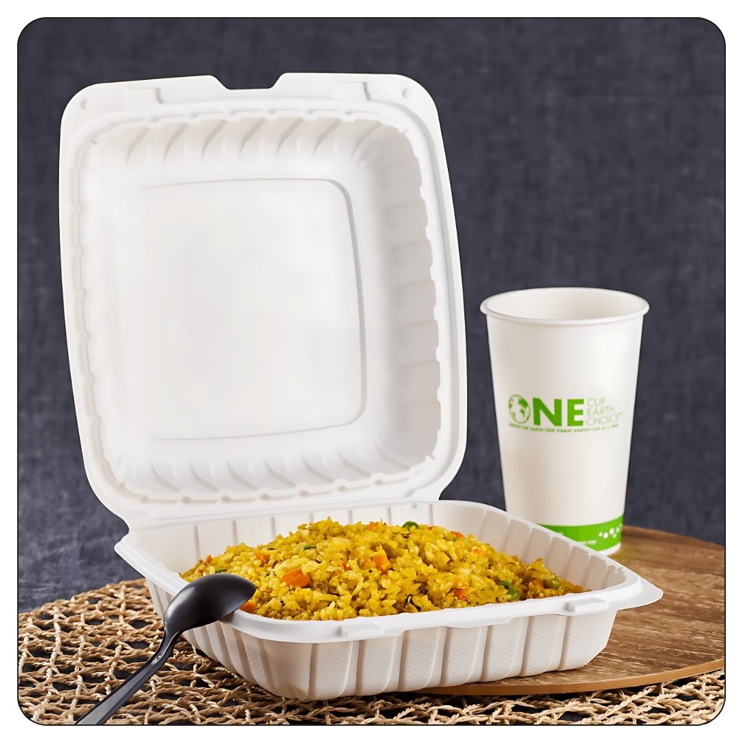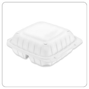Be the first to review “Microwaveable White Mineral-Filled Plastic Hinged Take-Out Container 1-Compartment 9″x9″”